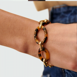 Le bracelet souple ARIA en écaille et doré, en laiton doré 750/1000 avec des maillons en acétate et fermoir T-bar, est disponible chez Tiffany Création pour 89 €.