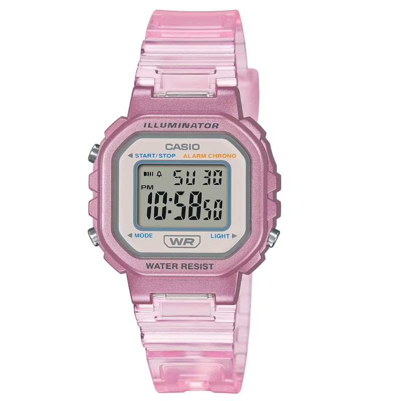 Montre Casio LA-20WHS-4AEF au look rose métallisé et bracelet semi-transparent. Style féminin, léger et pratique avec LED, chronomètre et alarme. Disponible chez Tiffany Création.