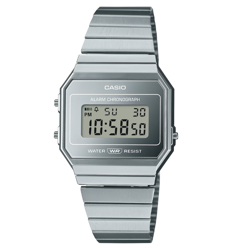 Montre Casio A700WEV-7AEF argentée : design fin, cadran épuré et style vintage intemporel. Élégance rétro et précision au poignet, signée Tiffany Création.