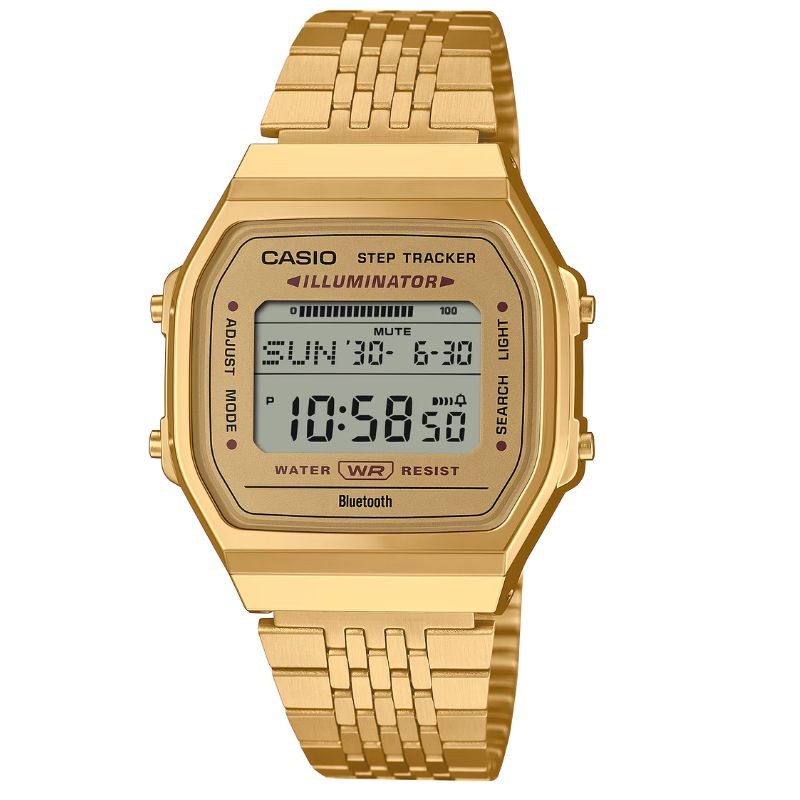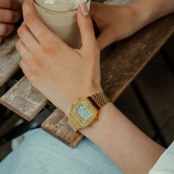 Chez Tiffany Création, la mode vintage se réinvente avec la Casio ABL-100WEG-9AEF, une montre qui allie design rétro doré et technologie connectée. Inspirée des classiques Casio Vintage, elle séduit par son boîtier doré en résine, son bracelet en acier inoxydable à mailles plates et son écran LCD aux lignes épurées.