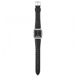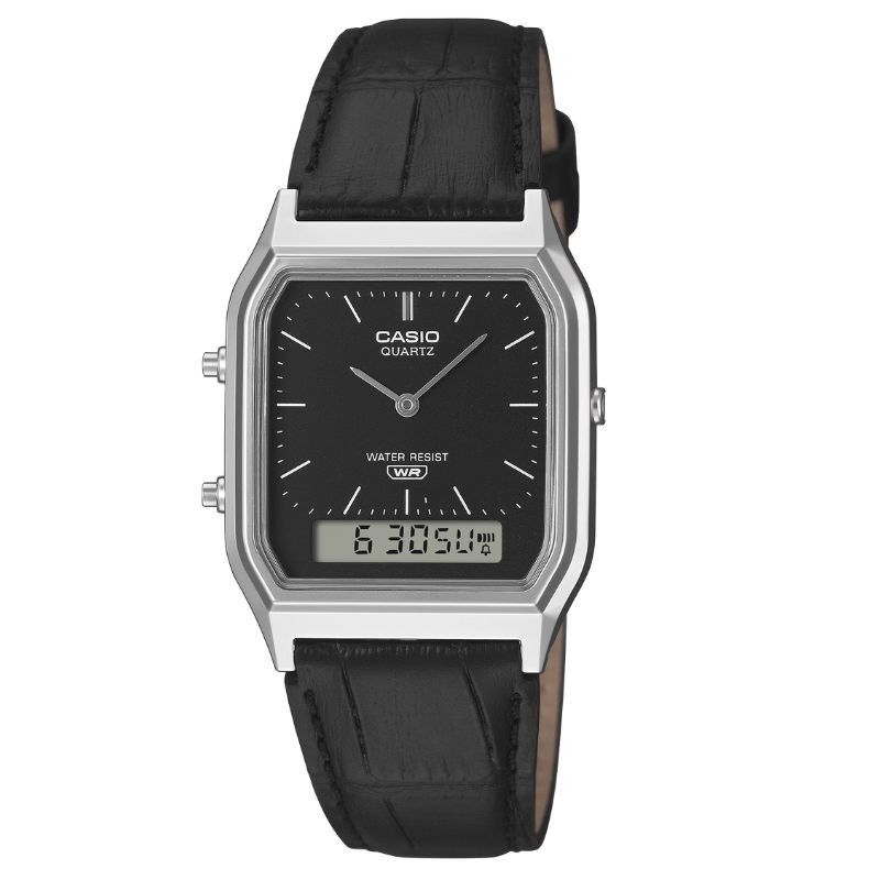 Montre Casio Vintage analogique-digitale, design rétro noir, bracelet cuir véritable, style élégant et fonctionnel, disponible chez Tiffany Création