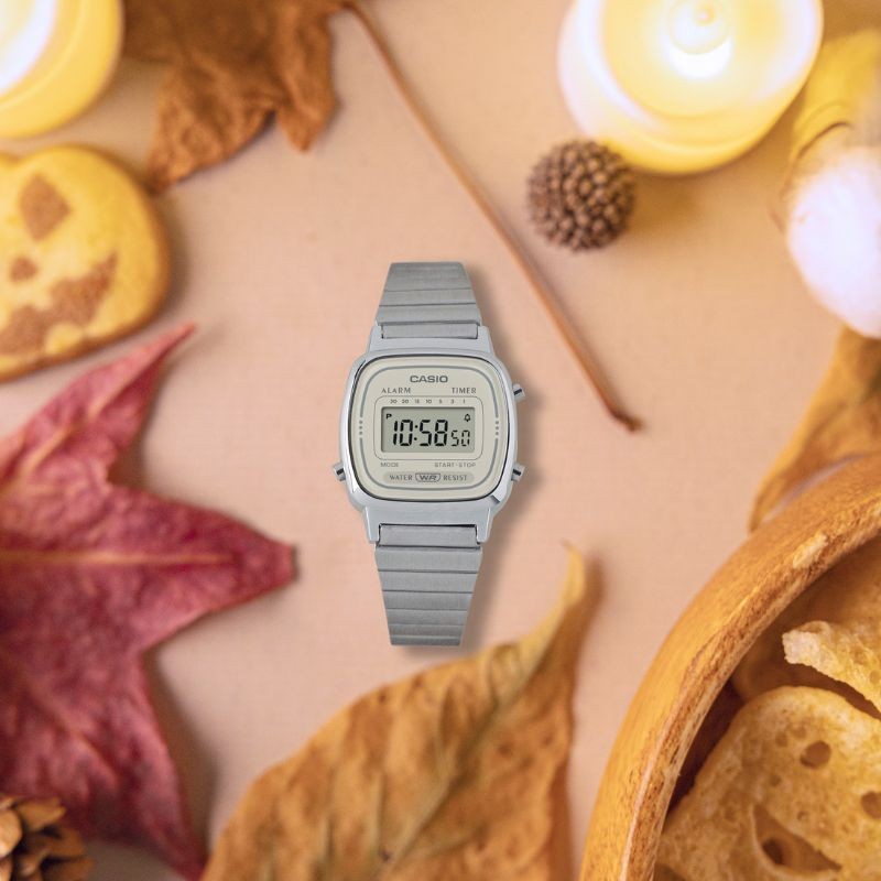 La Casio LA670WEA-8AEF incarne l’élégance discrète du design rétro avec une touche urbaine et contemporaine. Son boîtier carré chromé s’associe à un bracelet en acier inoxydable à fermoir réglable, pour un look à la fois minimaliste et tendance.