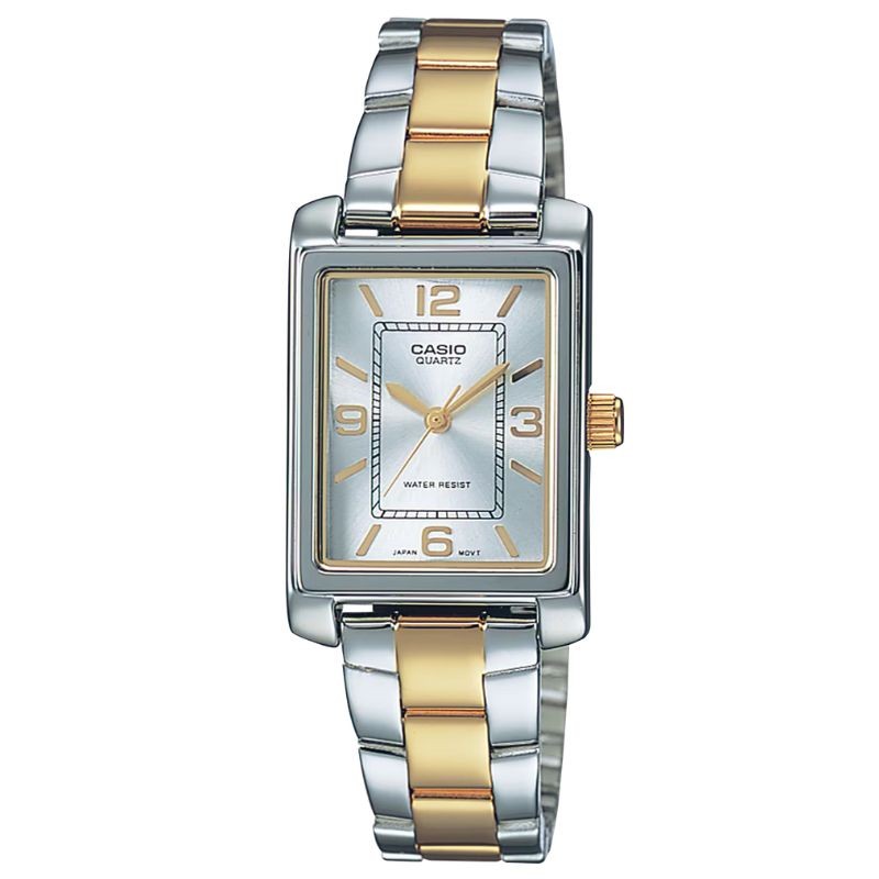Montre Casio Vintage femme réf. LTP-1234PSG-7AEG, bicolore doré/argenté, cadran argenté, date. Élégance rétro à 49,99€ chez Tiffany Création.