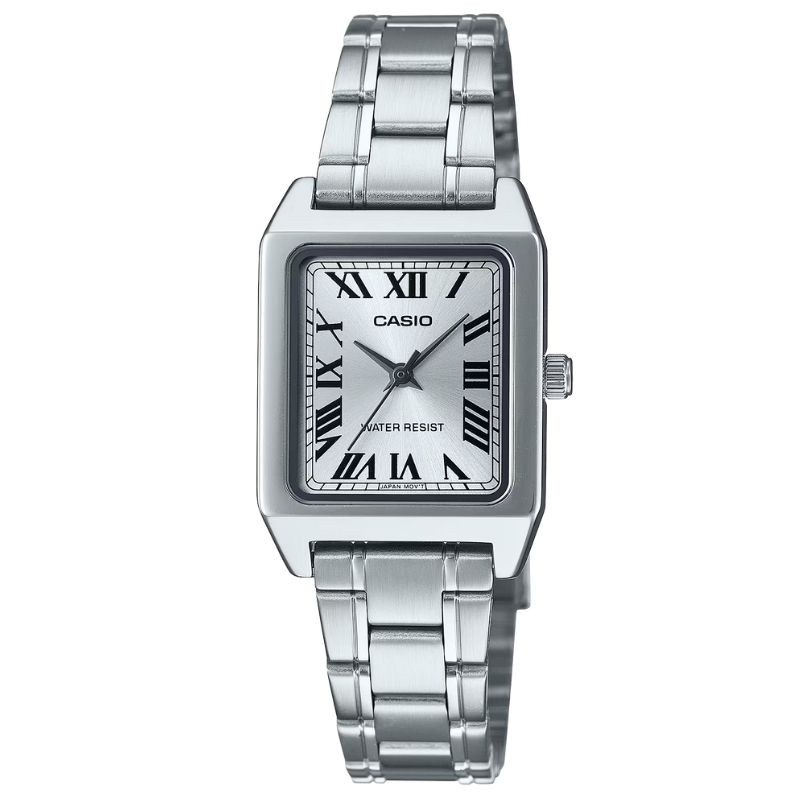 La Casio LTP-B150D-7BEF revisite la montre analogique classique dans une version carrée et moderne au design chic et intemporel. Avec son cadran argenté et ses chiffres romains noirs, elle incarne un parfait équilibre entre sobriété et élégance.